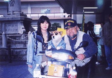 そのときまたまたひらめきで、リポーターになりきってマイクを持ち、蒲谷さんにインタビューをしてしまったのです。その時の映像がこちらです。 おじさんは、神奈川県在住の蒲谷哲(かばやさとし)さんという方でした。聞けば、子どもの頃おうちがまずしくて遠足にも行けなかった。そんな思いから、日本一周をおもいつき(詳しいいきさつは、次のページで)阪神大震災の募金活動をかねて、原付バイクで愛犬の柴犬ジローと日本一周していたのだそうです。